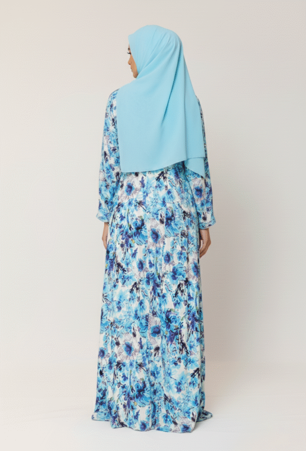 Featuring a mesmerizing watercolor-inspired blue floral print, this open-front abaya offers effortless style with a nursing-friendly button-down design, perfect for new mothers on the go. This set includes