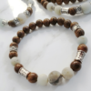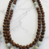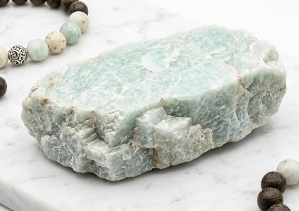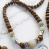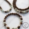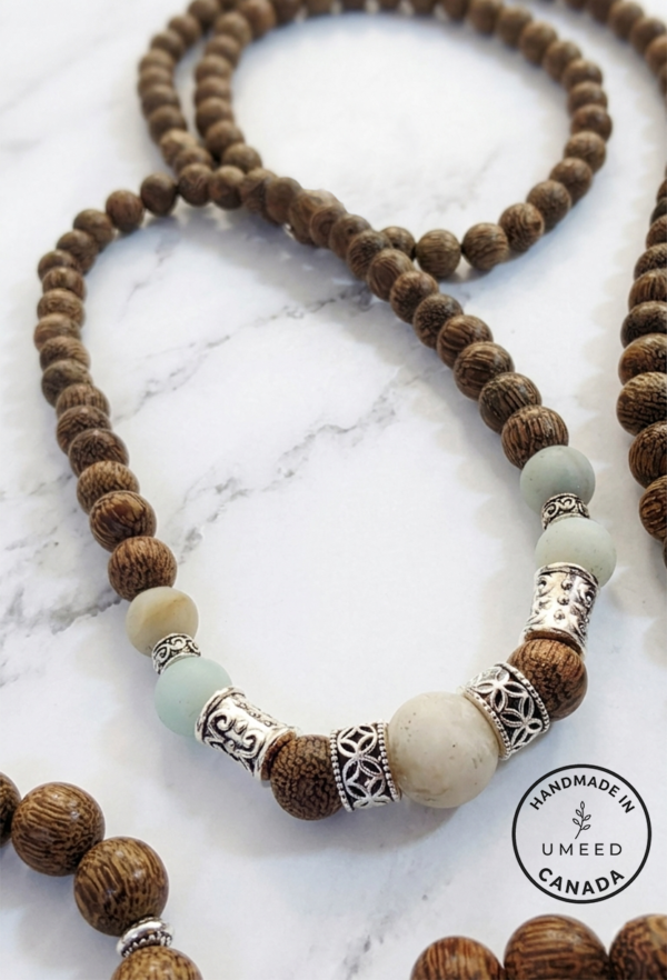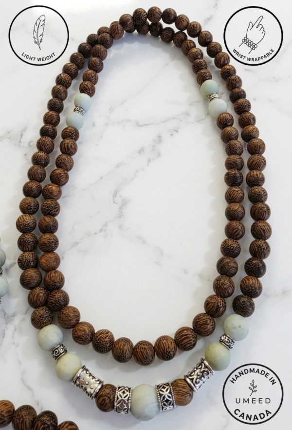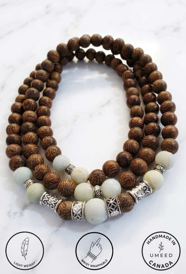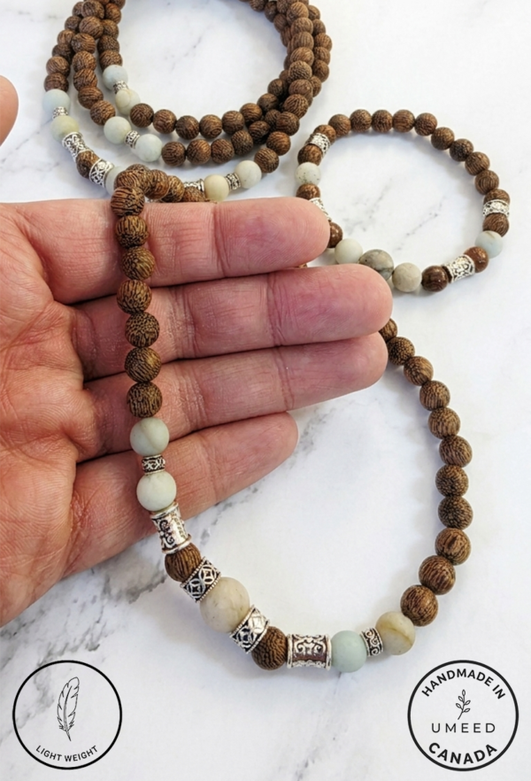 Lustrous Gemstones: Features hand-picked Amazonite, prized for its ability to filter stress and promote clear communication, set against the rich, textured grain of authentic Agarwood.