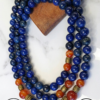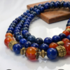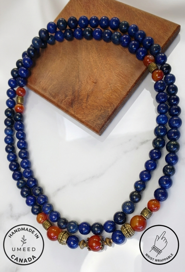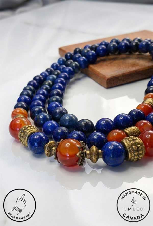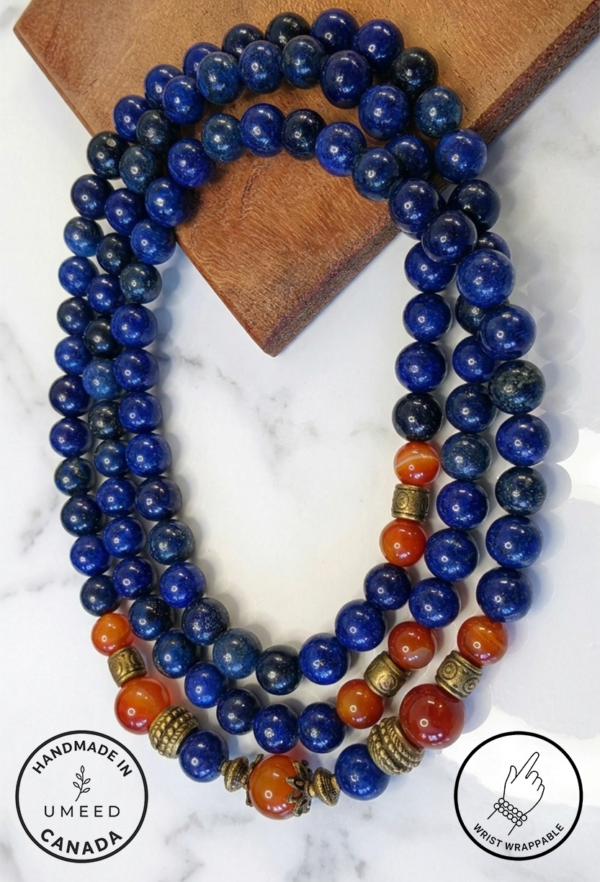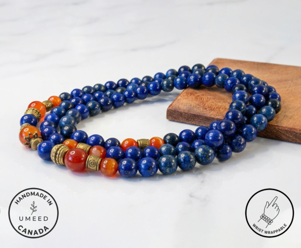 Bahr al-Nur – Experience the Depths of Celestial Light. This piece masterfully captures the contrast between the deep, infinite blue of Lapis Lazuli and the fiery, translucent glow of Carnelian Agate (Aqeeq). Finished with ornate brass-toned alloy accents, this majestic accessory is designed to be held as a sacred tool for prayer or worn as a multi-layer statement piece, serving as a constant reminder of the “Sea of Light” and the wisdom found in divine reflection.