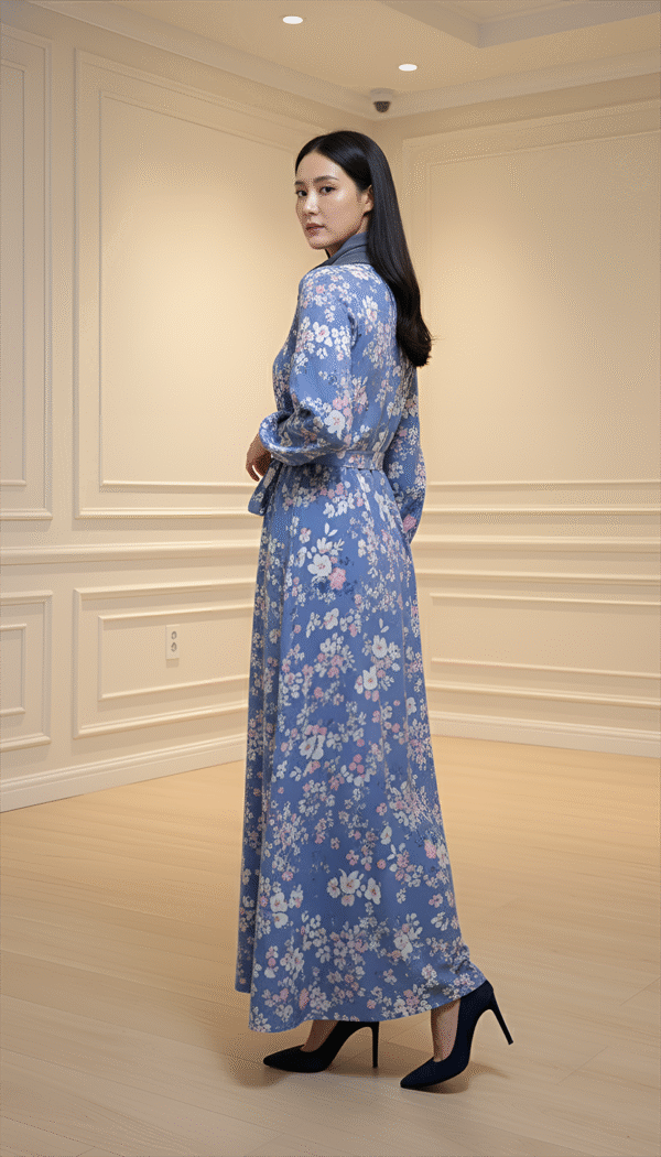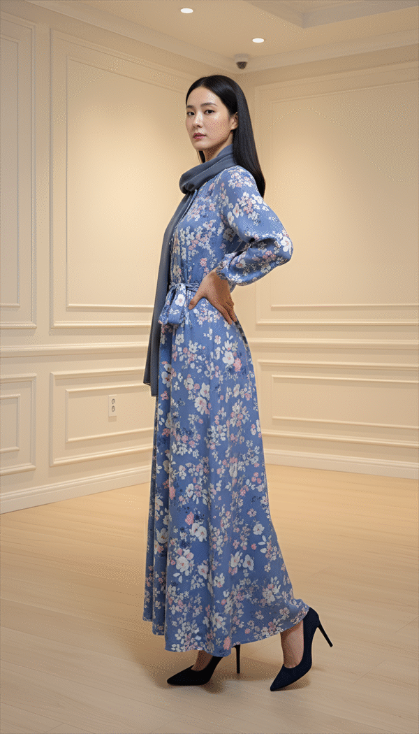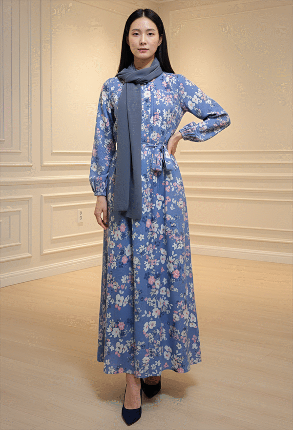 The Blue Blossom Long Dress is a modest floral maxi dress crafted from lightweight georgette for effortless grace and comfort.