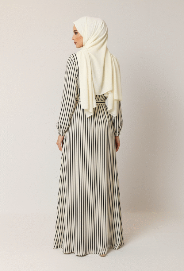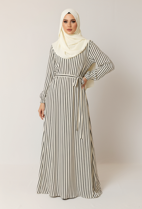 Elevate your wardrobe with this chic & versatile Elegant Striped Maxi Dress. Featuring a striking black & cream vertical stripe pattern, along with a matching tie-waist, this dress offers sophisticated & flattering silhouette.