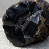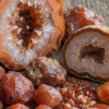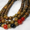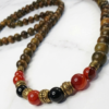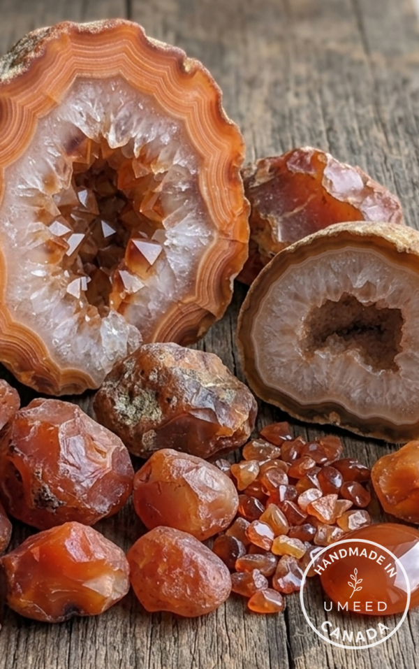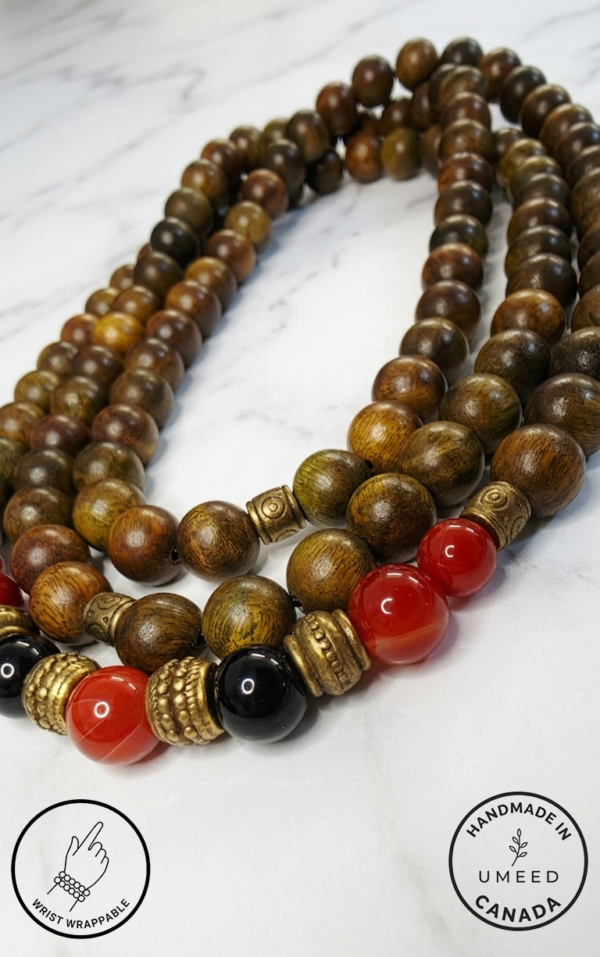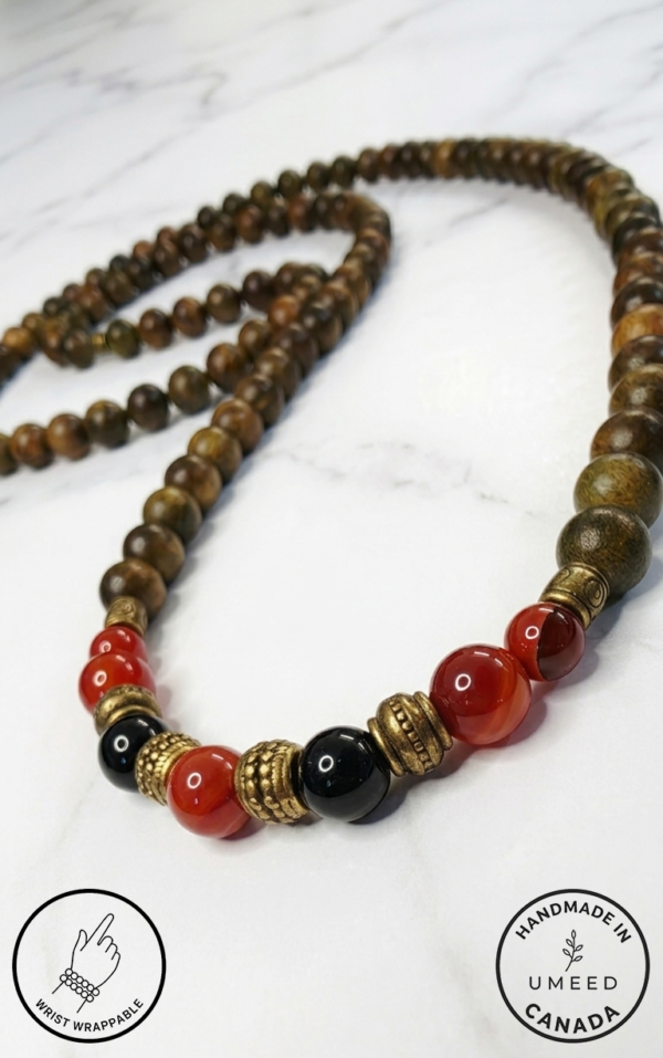 Vibrant Aqeeq & Onyx: Features rich Carnelian Agate for grounding and polished Black Onyx for focus, creating a striking visual contrast against the natural wood.
