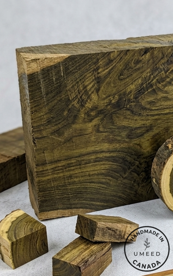 Lignum Vitae: Crafted with authentic Lignum Vitae, one of the densest and most resilient woods in the world, prized for its olive-green to deep-brown feathered grain and natural, subtle fragrance.