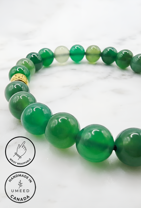 Silent Imperial – A testament to quiet luxury and meditative depth. This piece thoughtfully balances the translucent, verdant glow of Green Agate with the regal, polished brilliance of ornate gold accents. Finished with intricate golden alloy spacers, this versatile Tasbih is designed to provide a high-end tactile experience, serving as a constant reminder of inner sovereignty and spiritual peace.