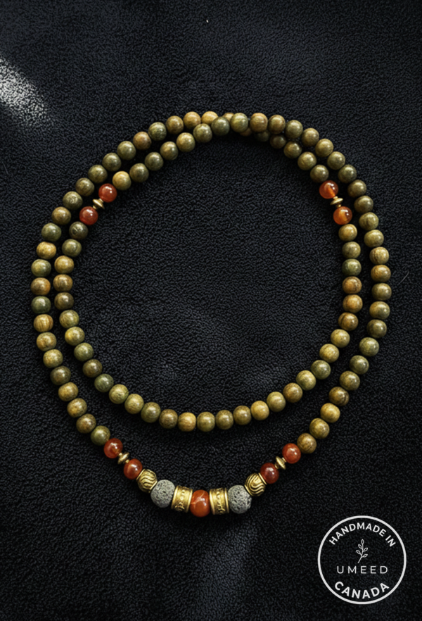 Fiery Accents: Warm carnelian stones and intricate gold-toned spacers provide a striking contrast to the earthy wood.