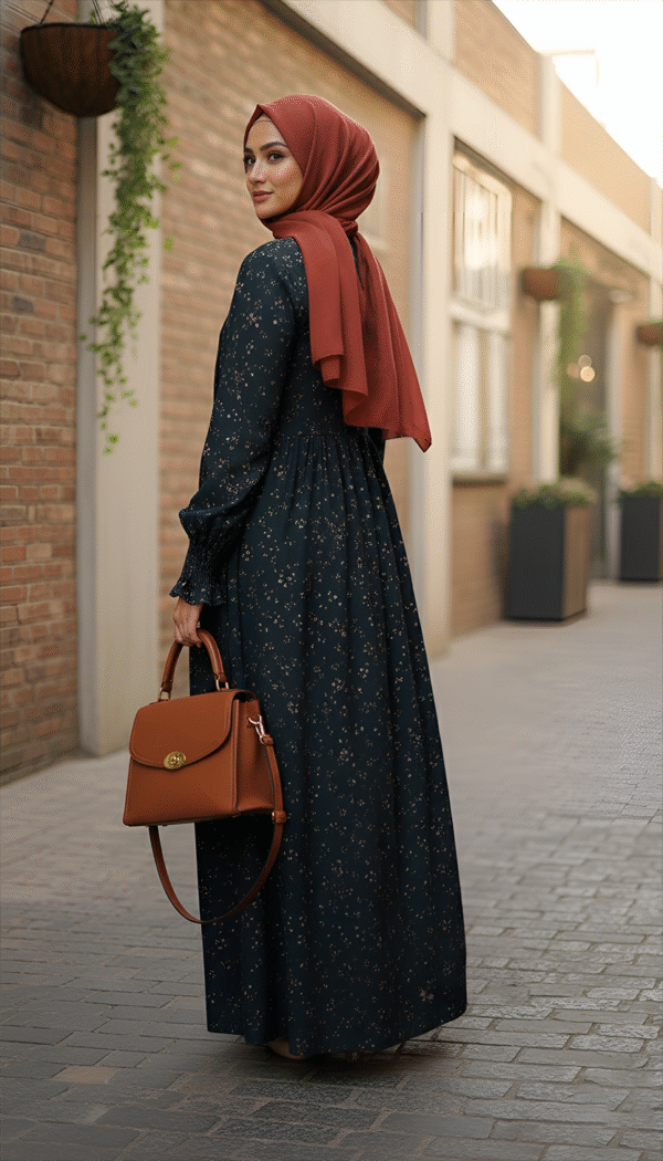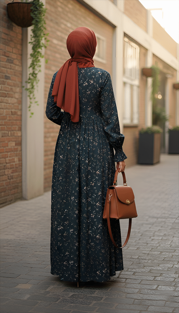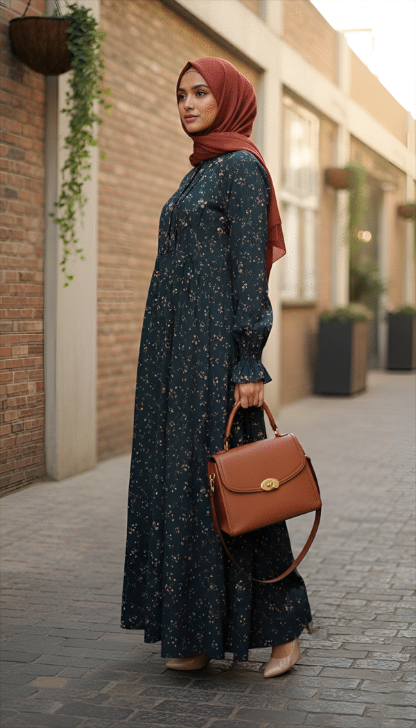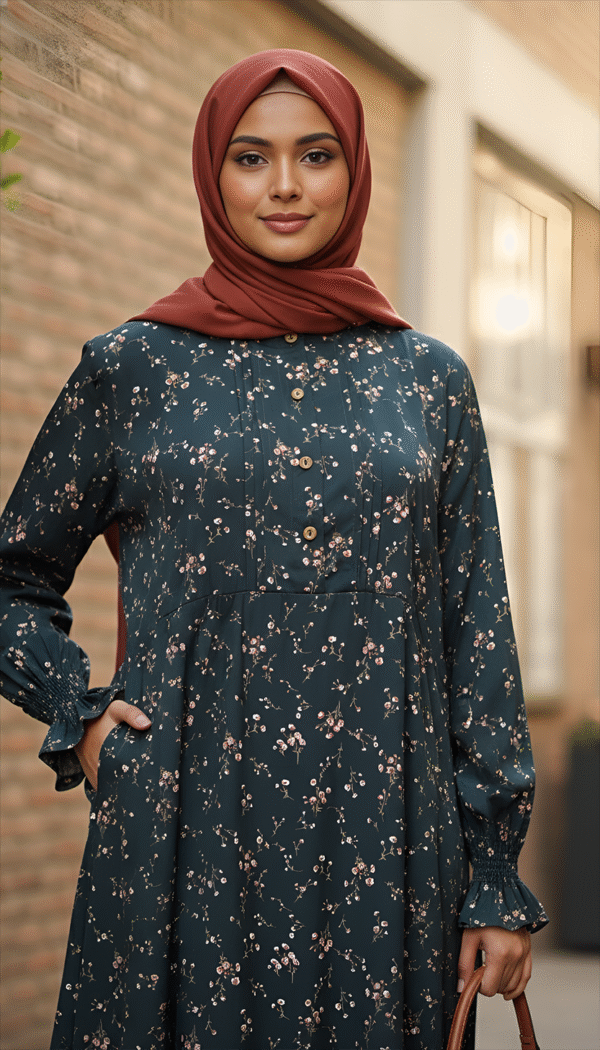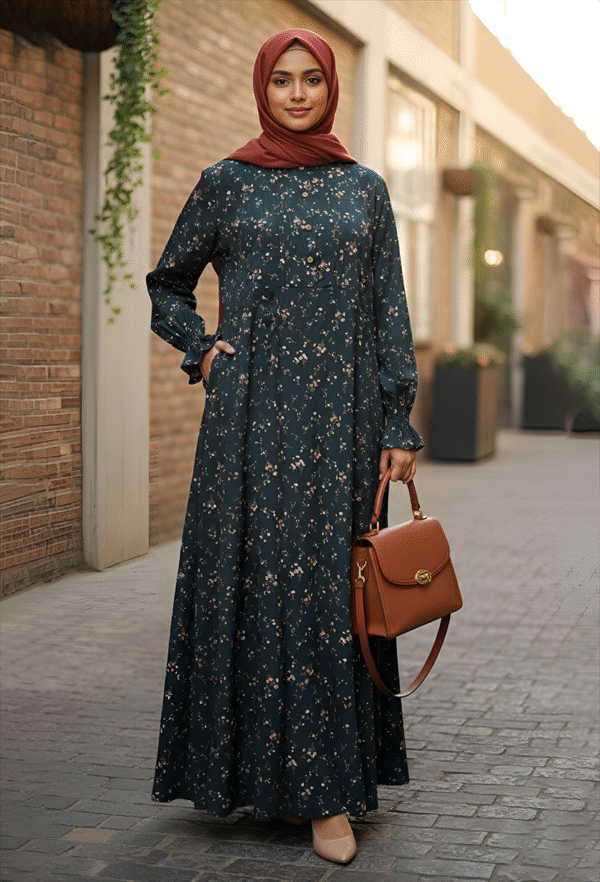 Verdant Bloom Long Dress is defined by its rich, botanical green hue and timeless tailoring. The deep, verdant canvas is brought to life by a scattering of soft pink blossoms, creating a look that feels both fresh and grounded in nature.